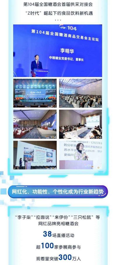 4月7日,促循環(huán)、開新局——第104屆全國糖酒會主論壇成功舉辦。在會上,中金公司首席策略師王漢鋒發(fā)表主題為“探索中國經(jīng)濟(jì)新動能”的演講,從宏觀角度研判2021年經(jīng)濟(jì)形勢,探索未來5年中國經(jīng)濟(jì)增長引擎;中國輕工業(yè)聯(lián)合會副秘書長于學(xué)軍通過運(yùn)行情況、運(yùn)行分析、趨勢預(yù)測、發(fā)展建議等權(quán)威數(shù)據(jù)發(fā)布,對2021年食品工業(yè)運(yùn)行趨勢進(jìn)行了分析預(yù)判;中國工程院院士陳堅(jiān)教授在會上提出“食品營養(yǎng)健康的突破將成為食品發(fā)展的新引擎、食品物性科學(xué)的進(jìn)展將成為食品制造的新源泉、食品全鏈條技術(shù)的融合將成為食品產(chǎn)業(yè)的新模式”等觀點(diǎn)。汾酒集團(tuán)副總經(jīng)理?xiàng)畈?,蒙牛集團(tuán)執(zhí)行總裁李鵬程和騰訊營銷洞察首席洞察官尹冠群等企業(yè)嘉賓也分別從行業(yè)社會效益、企業(yè)戰(zhàn)略規(guī)劃、數(shù)字化營銷等方面對與會觀眾進(jìn)行了精彩的觀點(diǎn)分享。