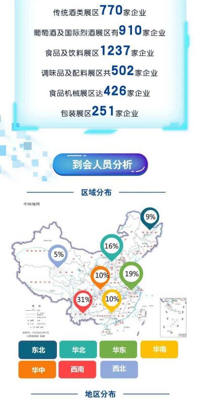 本屆糖酒會展覽總面積21.5萬平方米,共劃分為六大展區(qū),并在其中特設(shè)11個小型特色專區(qū)。來自42個國家和地區(qū)的4106家食品飲料、酒類、調(diào)味品、機(jī)械包裝及技術(shù)服務(wù)企業(yè)參展。其中,傳統(tǒng)酒類展區(qū)770家企業(yè)參展,茅臺、五糧液、汾酒、瀘州老窖、劍南春、郎酒、水井坊、舍得、酒鬼酒、紅星、牛欄山、豐谷、景芝、泰山、扳倒井、仰韶、寶豐、宋河、古越龍山、會稽山、塔牌、燕京啤酒等龍頭企業(yè)悉數(shù)參展;葡萄酒及國際烈酒展區(qū)有910家企業(yè)參展,云集法國、意大利、德國、阿根廷、智利、西班牙、加州等國家和地區(qū)展團(tuán)及長城、中糧名莊薈、天津王朝、挖酒網(wǎng)等知名國產(chǎn)品牌;食品及飲料展區(qū)是本次展商數(shù)量最多的展區(qū),參展商達(dá)1237家,其中進(jìn)口食品約200家,可口可樂、中國茶葉、首農(nóng)集團(tuán)、光明乳業(yè)、蒙牛乳業(yè)、今麥郎、我買網(wǎng)、天津食品集團(tuán)、來伊份、李子柒、九陽豆業(yè)、椰樹椰汁、統(tǒng)一、三只松鼠、金嗓子、好麗友、雅客、東來順等知名企業(yè)參展;調(diào)味品及配料展區(qū)共502家企業(yè),中糧糖業(yè)、安琪酵母、益海嘉里、太太樂、魯花、中糧工食、小龍坎、郫縣豆瓣、新希望味業(yè)、劉一手、天味食品、川娃子、紫林醋業(yè)、寧化府、水塔醋業(yè)等知名企業(yè)參展;食品機(jī)械展區(qū)達(dá)436家企業(yè),其中近三分之一為國際知名機(jī)械廠商;包裝展區(qū)251家企業(yè),主要來自鄆城、溫州等知名包裝產(chǎn)業(yè)聚集地。
