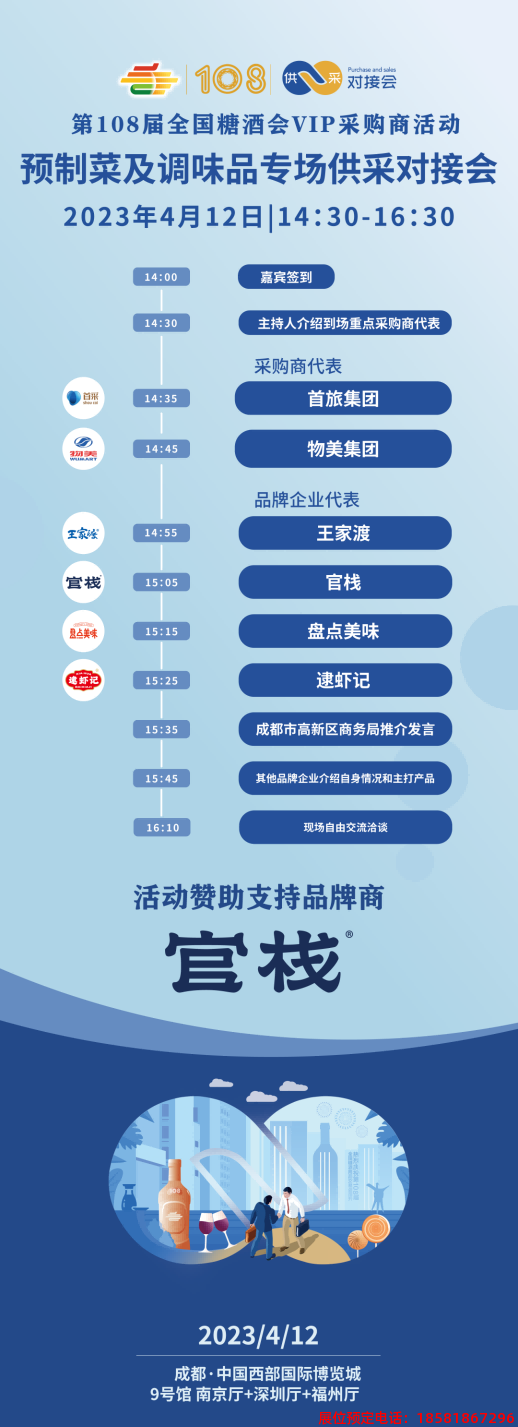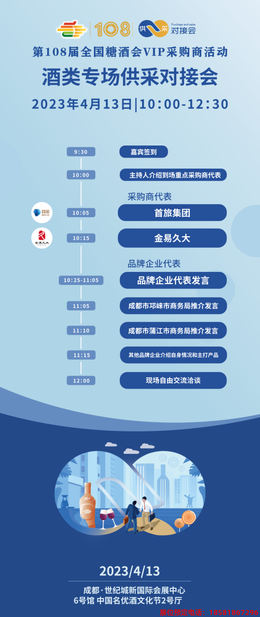 第108屆全國糖酒會VIP采購商活動將于2023年4月12日-13日在成都舉辦。本屆VIP采購商活動在原有基礎(chǔ)上,再次創(chuàng)新升級!相較去年,創(chuàng)新并優(yōu)化了采購流程,打造多場景、高頻次買賣雙方交流場景。除食品飲料專場供采對接會、酒類專場供采對接會以外,還重點推出了預制菜及調(diào)味品專場供采對接會。